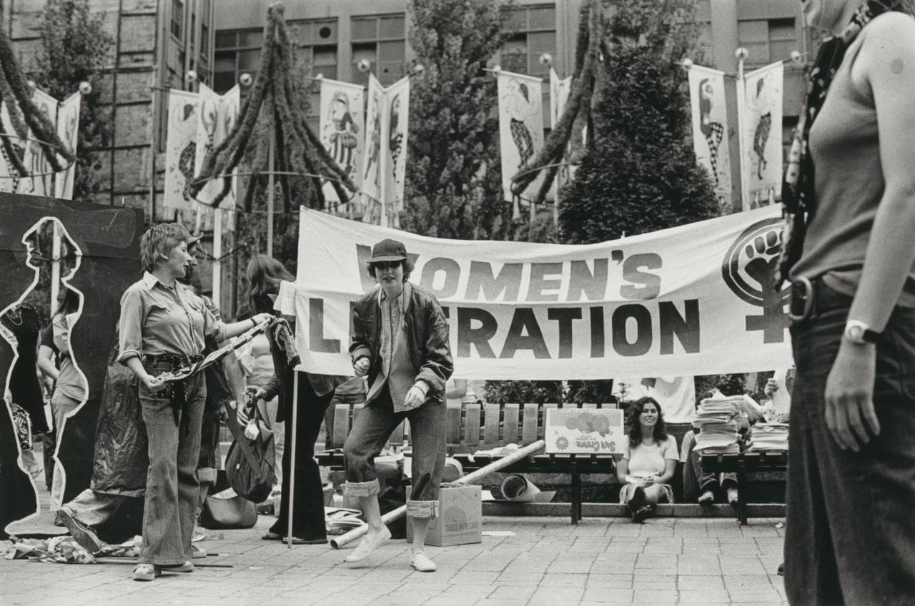 Ponch Hawkes – No title (Women’s Theatre Group, performing outdoors beneath a Women’s Liberation banner in the City Square) (1975)
