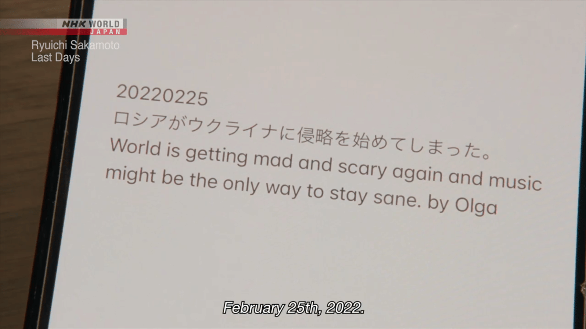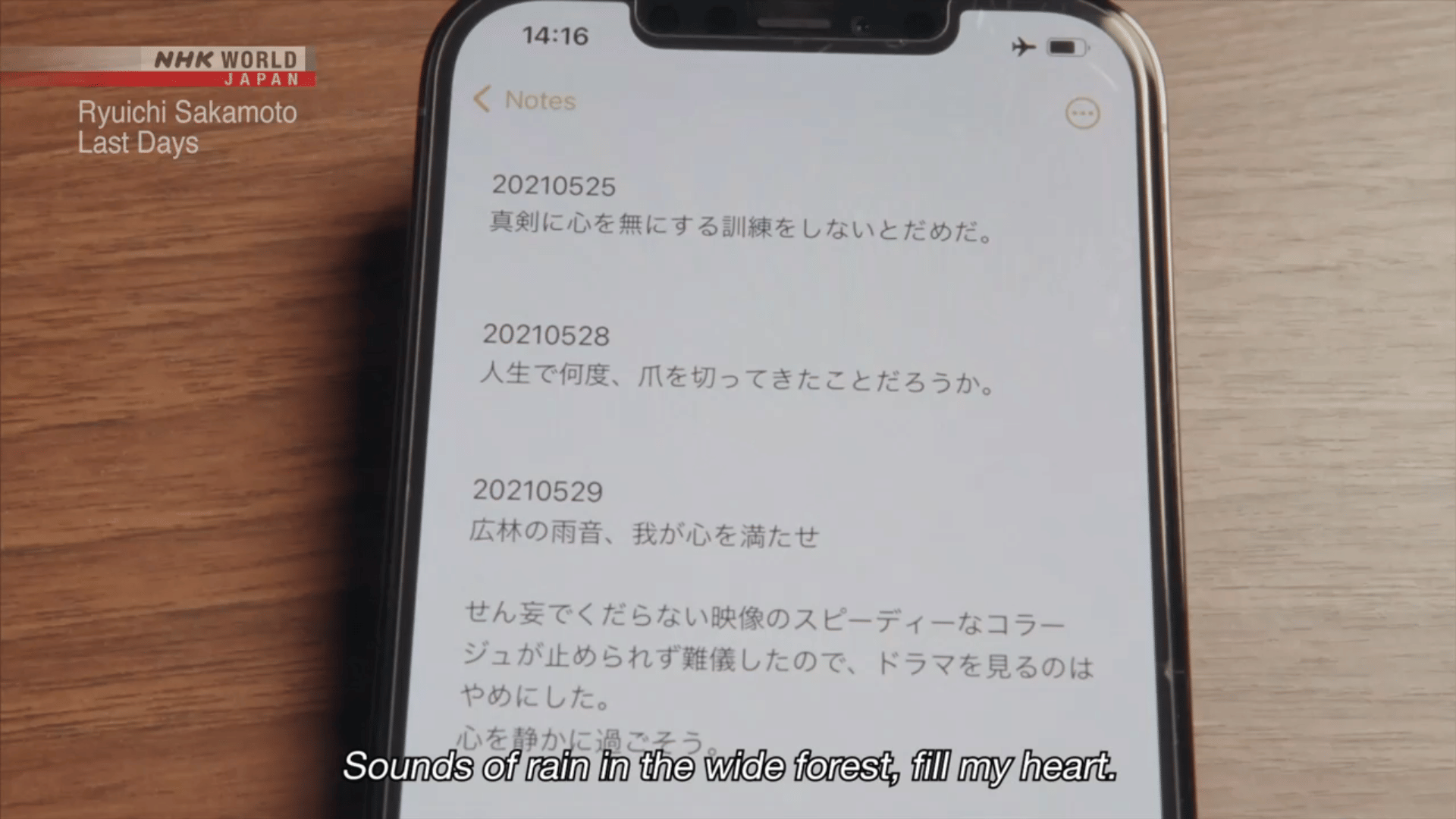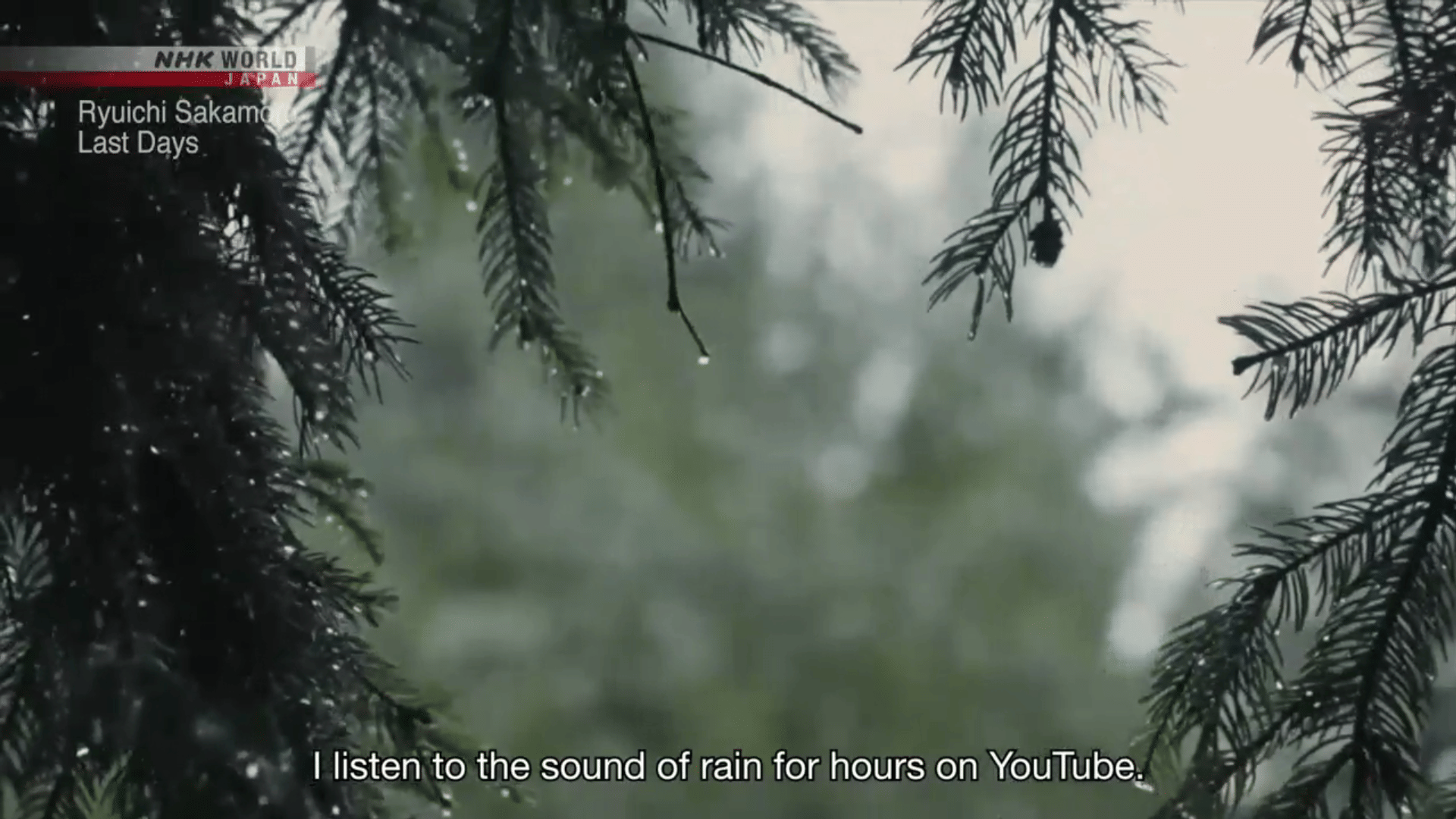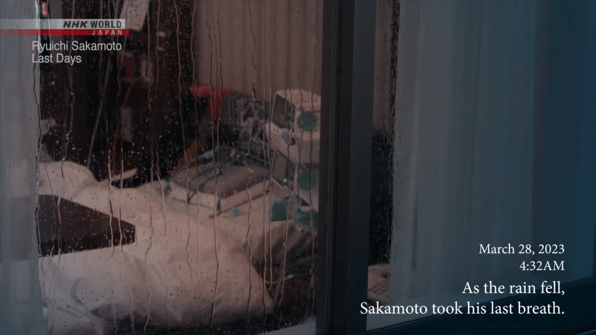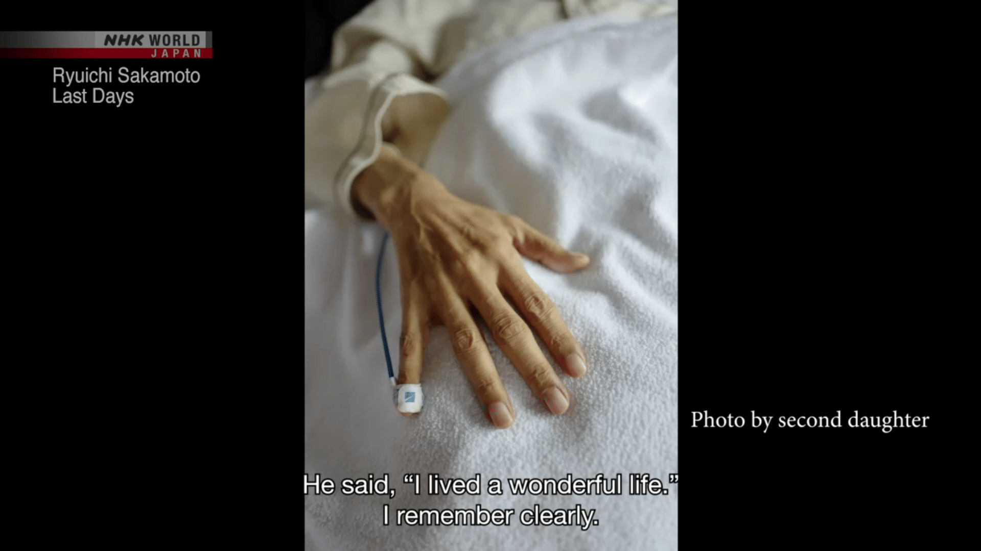 In his final years, Sakamoto listened to recordings of the rain for hours, read books, cried at the sight of hydrangeas, and continued to compose music. In his final days, he listened to his favorite songs, said good-bye to his children, and stated that he had lived a wonderful life.