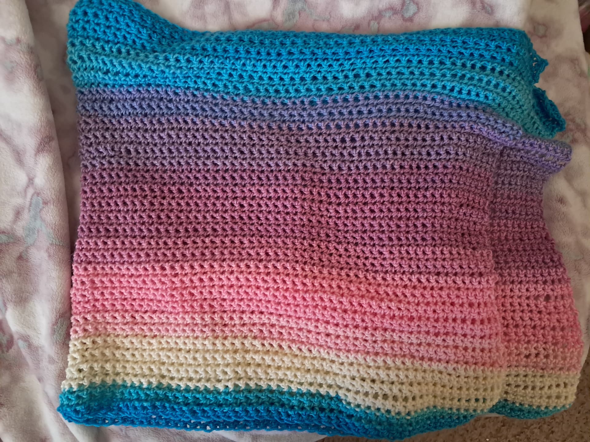 Finished my shawl overnight. I stayed up way too late, but I wanted to complete it. I like the colors! They remind me of a unicorn or a little girl's birthday cake. It's hard to believe this shawl is made of thousands of stitches created by my own hands.