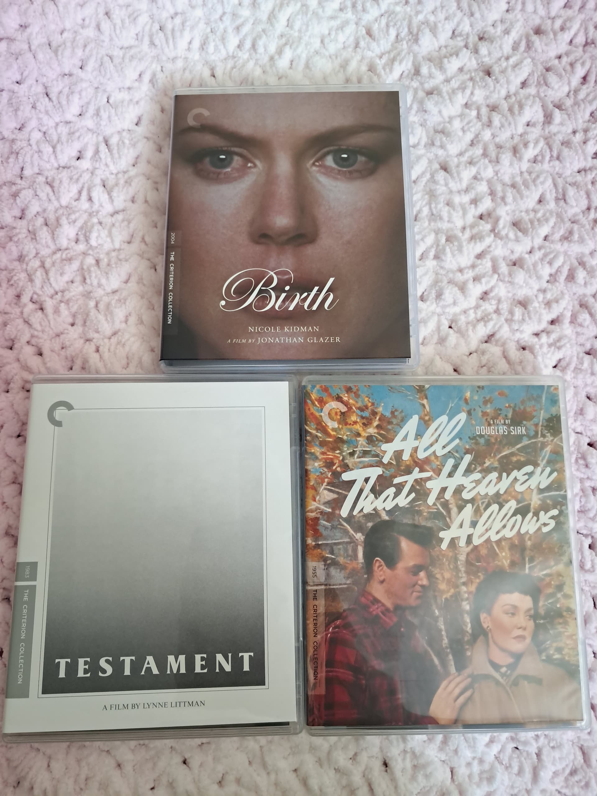 It was a good mail day. My Criterion Collection blu-rays for Birth, Testament, and All That Heaven Allows arrived! Birth is one of my all-time favorite films. I saw it when it was released in 2004, and all I've had since then is a DVD. I'm very happy it finally received the Criterion treatment. I rarely buy blu-rays. I happened to save up my Criterion Channel gift cards. I scored this haul for only $10!